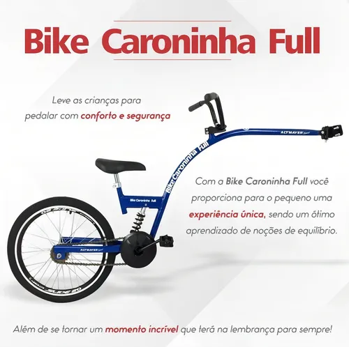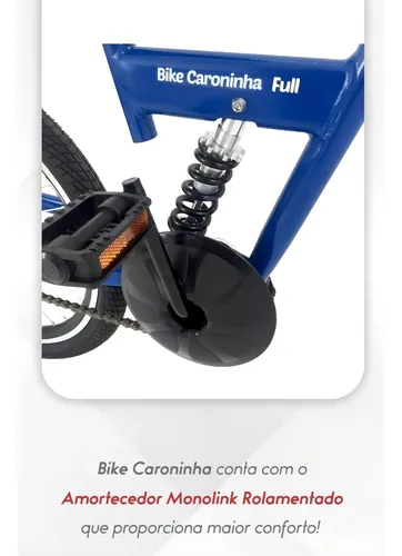 Bike Caroninha Full com amortecedor é perfeita para proporcionar às crianças uma pedalada confortável e segura. Com montagem simples, oferece uma experiência única para a criança, sendo excelente para aprender noções de equilíbrio e o hábito de pedalar. O quadro, com design exclusivo e amortecedor, facilita o embarque e desembarque da criança. Pode ser instalado em bicicletas do aro 26 ao 29. Quando fixado no canote do selim, proporciona estabilidade, conforto e segurança na pedalada. Produto 100% nacional, com quadro feito em aço carbono, pintura eletrostática de alta qualidade e componentes de primeira linha, o que o torna leve e extremamente resistente, suportando cargas de até 60 kg.