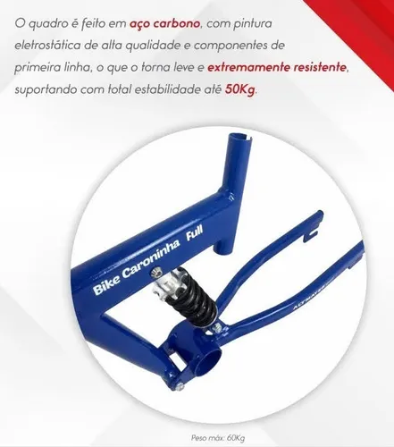 Diferenciais: Produto 100% Nacional, com quadro feito em aço carbono, pintura eletrostática de alta qualidade e componentes de primeira linha, o que o torna leve e extremamente resistente, suportando cargas de até 60 kg.